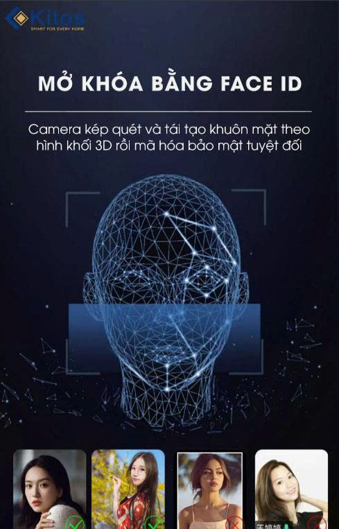 Kitos KT-X8 FACE ID được trang bị công nghệ nhận diện khuôn mặt tiên tiến nhất. Không chỉ đơn giản nhận diện khuôn mặt thông thường, công nghệ nhận diện 3D quét đa góc cạnh và đường nét rồi mã hóa bảo mật tuyệt đối. Nhận diện được ngày cả trong môi trường thiếu sáng, đeo khẩu trang. Đặc biệt là chống nhận diện khuôn mặt giả bằng hình ảnh hoặc video.