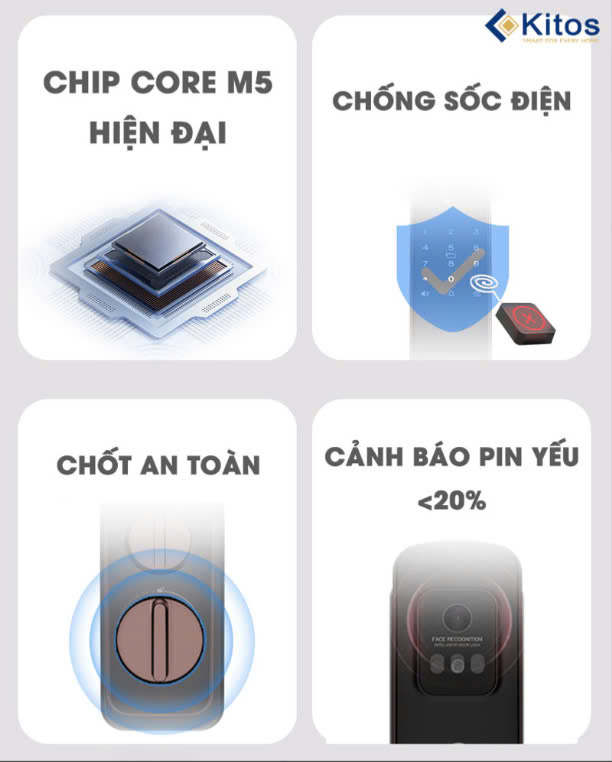 Chức năng : Nhận diện khuôn mặt, vân tay, thẻ , mã số , chìa cơ, app điện thoại