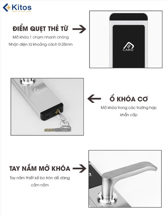 - Kitos KC880 hiện đại và tiện lợi, khóa mở cửa bằng thẻ từ và chìa cơ dự phòng.